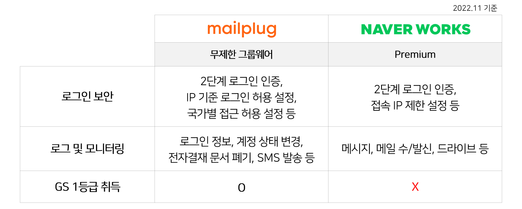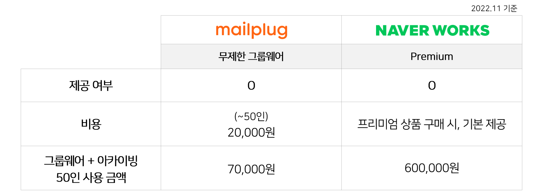 기업메일의 용량을 무제한으로 제공하는 상품을 기준으로 비교해보겠습니다.