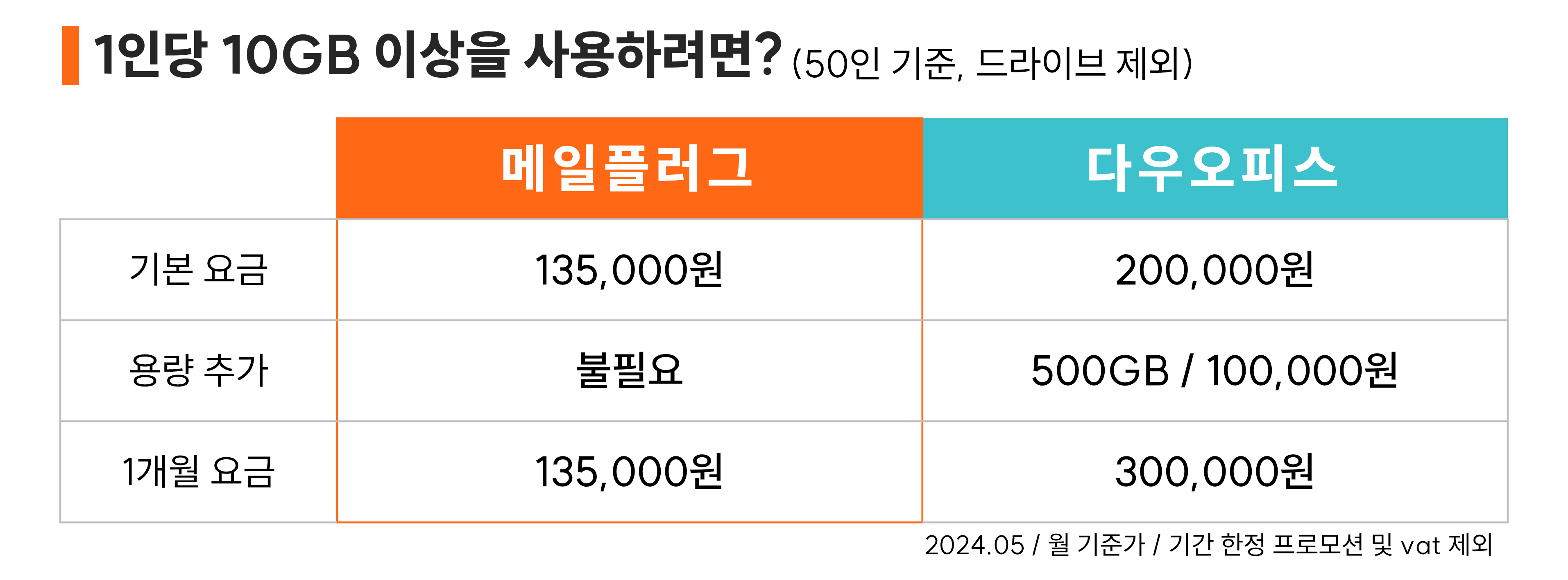 메일플러그는 무제한 용량(드라이브 예외)인 반면,