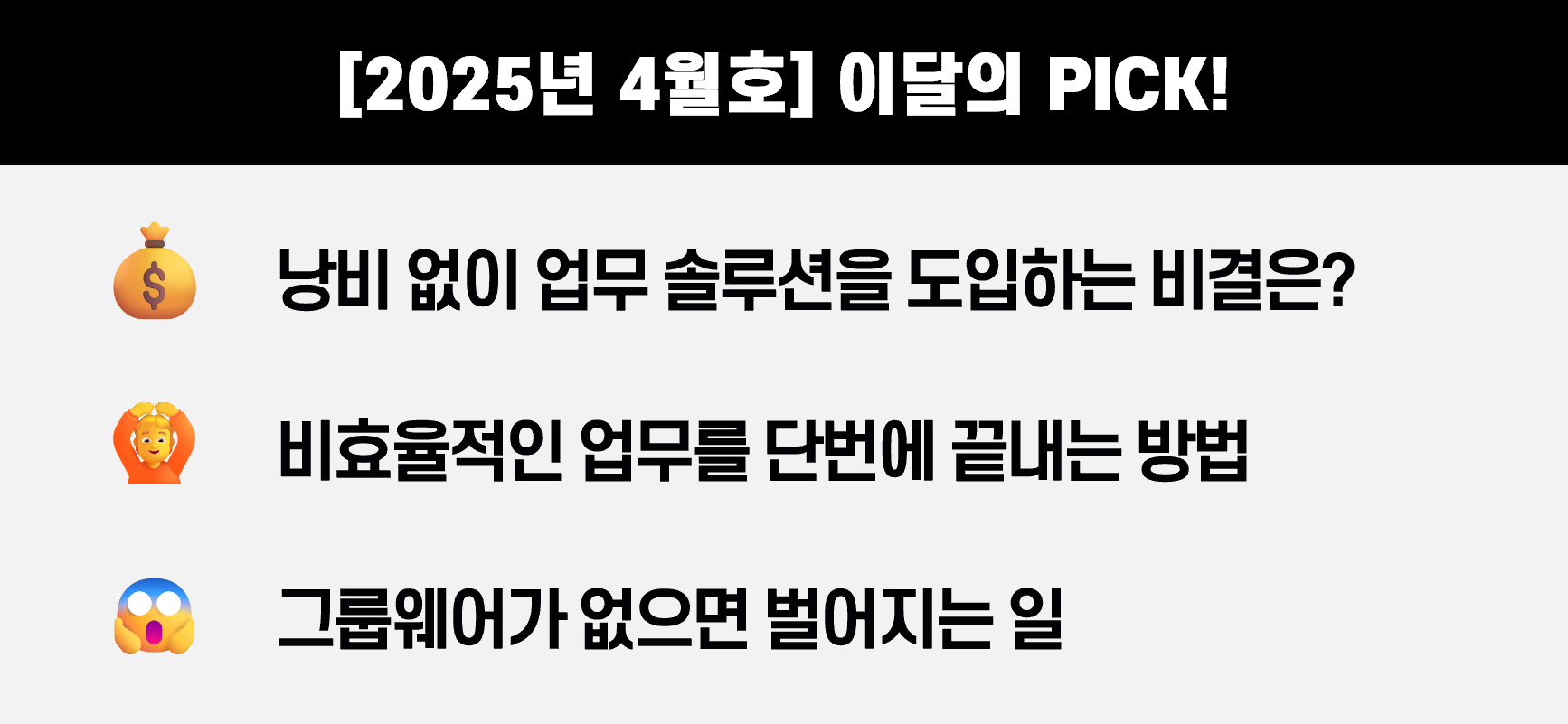 | [2025년 5월호] 그룹웨어 도입, 이것만 알면 끝! 핵심 요약본 (0) | 2025.05.14 |