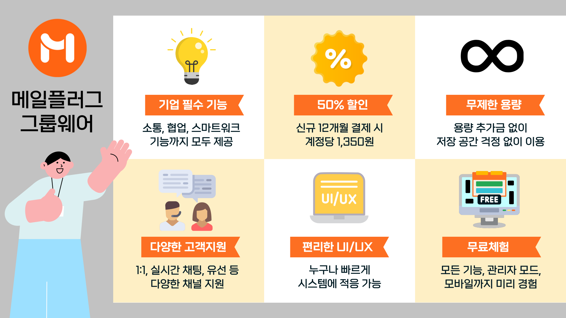 메일플러그에서는 메일, 메신저, 근태관리, 전자결재, 업무관리 등
